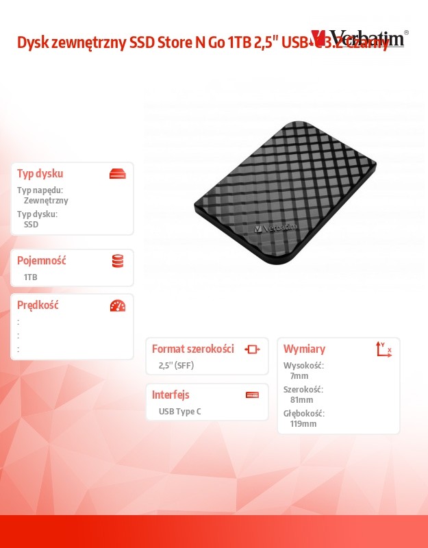 Verbatim Dysk zewnętrzny SSD Store N Go 1TB 2,5" USB-C 3.2 Czarny